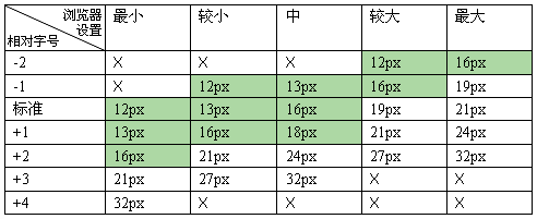 以IE瀏覽器為例,如果頁麵上的文字被設置為相對字號,那麼它可以有五種不同的大小縮放:“最小、較小、中、較大、最大”。下表中是不同的相對字號在IE瀏覽器的不同設置中所顯示的實際字號(以象素為單位的字號)。